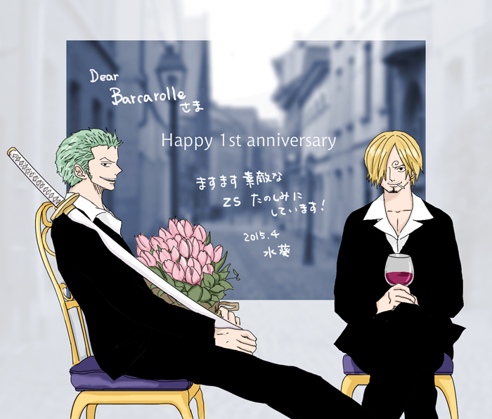 ロロノアがスーツで花束抱えてます。サンジさんが煙草をくわえた口元に笑みを浮かべながらこちらを見てます!